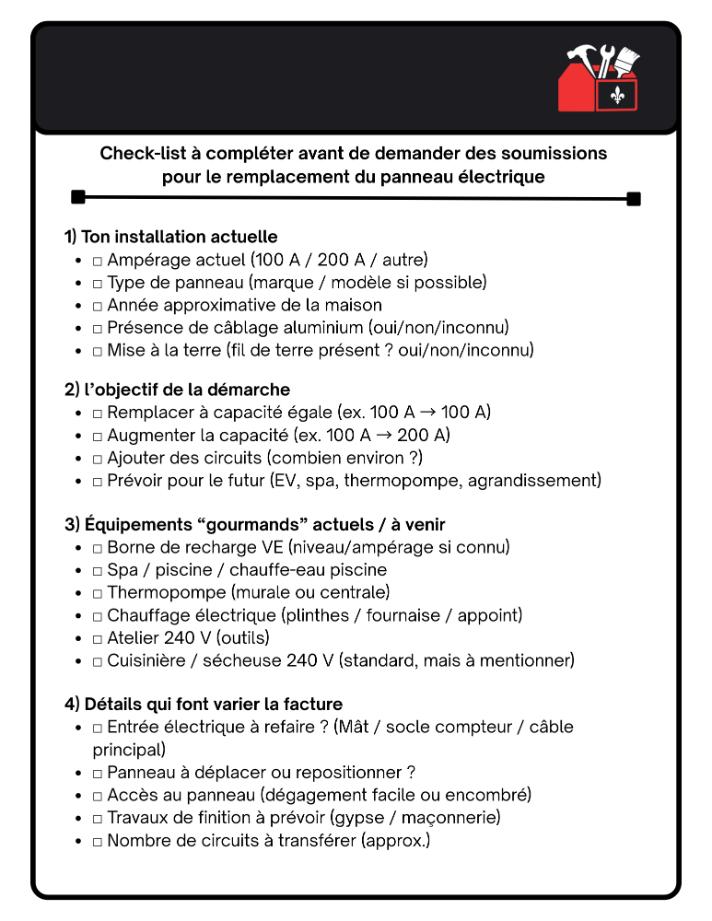 Nous vous proposons checklist prête à cocher avant de demander une soumission pour un remplacement de panneau électrique. Vous pouvez d’ailleurs télécharger la liste en format PDF. Le tout est disponible ci-bas.